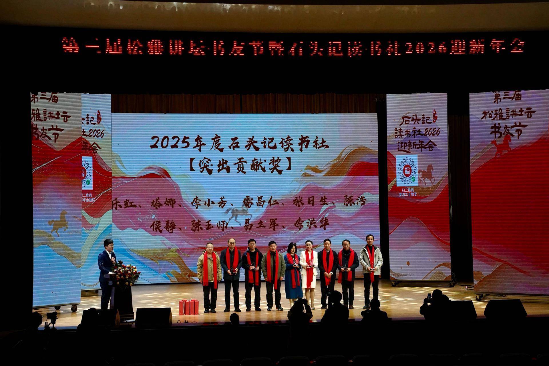 活动现场还举行了荣誉表彰仪式,对 2025 年度为 “松雅讲坛”“片页度关山”和石头记读书社发展作出突出贡献的优秀个人予以表彰。穿插进行的三轮幸运抽奖环节,更是一次次点燃现场气氛,将新年的喜悦与美好祝福送到每一位参与者手中。